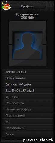 |  Мини профиль с временем суток и функциональным меню для пользователя Установка: Вставляем в блок: Код <?if($USER_LOGGED_IN$)?> <table width="100%" border="0" cellspacing="0" cellpadding="0"> <tr> <td align="center"> <b><SCRIPT LANGUAGE="javascript"> currentTime = new Date(); if (currentTime.getHours() >= 6 && currentTime.getHours() <= 11 ) document.write("Доброе утро, "); if (currentTime.getHours() >= 12 && currentTime.getHours() <= 17 ) document.write("Добрый день, "); if (currentTime.getHours() >= 18 && currentTime.getHours() <= 23) document.write("Добрый вечер, "); if (currentTime.getHours() >= 0 && currentTime.getHours() <= 5) document.write("Доброй ночи, "); function openOnClick(client_type) { if(client_type=="mail")clientWindow = window.open("$PM_URL$","pmw","scrollbars=1,top=0,left=0,resizable=1,width=850,height=350") || alert("Отключите блокировку всплывающих окон!"); if(client_type=="send")clientWindow = window.open("/index/14-999-0-1","pms","scrollbars=1,top=0,left=0,resizable=1,width=850,height=350") || alert("Отключите блокировку всплывающих окон!"); if(client_type=="options")clientWindow = window.open("/index/11","options","scrollbars=1,top=0,left=0,resizable=1,width=680,height=350") || alert("Отключите блокировку всплывающих окон!"); if(client_type=="users")clientWindow = window.open("$USERS_LIST_URL$","users","scrollbars=1,top=0,left=0,resizable=1,width=680,height=350") || alert("Отключите блокировку всплывающих окон!"); if(client_type=="rules")clientWindow = window.open("/rules.html","rules","scrollbars=1,top=0,left=0,resizable=1,width=680,height=350") || alert("Отключите блокировку всплывающих окон!"); } </SCRIPT> $USERNAME$</b><br><div class="screenshot"><?if($USER_AVATAR_URL$)?> <img title="$USERNAME$" src="$USER_AVATAR_URL$" border="0"> <script type="text/javascript" src="http://activiks.ru/img/png.js"></script> <?else?><?if($USER_LOGGED_IN$)?><img title="$USERNAME$" src="http://bambun.ru/images/11.png" border="0" width="140px"><?endif?><?endif?></div></td> </tr> <tr> <td><div id="middle_block_right"> <li><a class="b1" >Логин: $USERNAME$</a></li><div id="hras"></div> <li><a class="b1" >$USER_GROUP$</a></li><div id="hras"></div> <li><a class="b1" >Вы у нас: $USER_REG_DAYS$-й день</a></li><div id="hras"></div> <li><a class="b1" >Ваш IP: $IP_ADDRESS$</a></li><div id="hras"></div> <li><a class="b1" >Личных сообщений: $UNREAD_PM$</a></li><div id="hras"></div> </div>